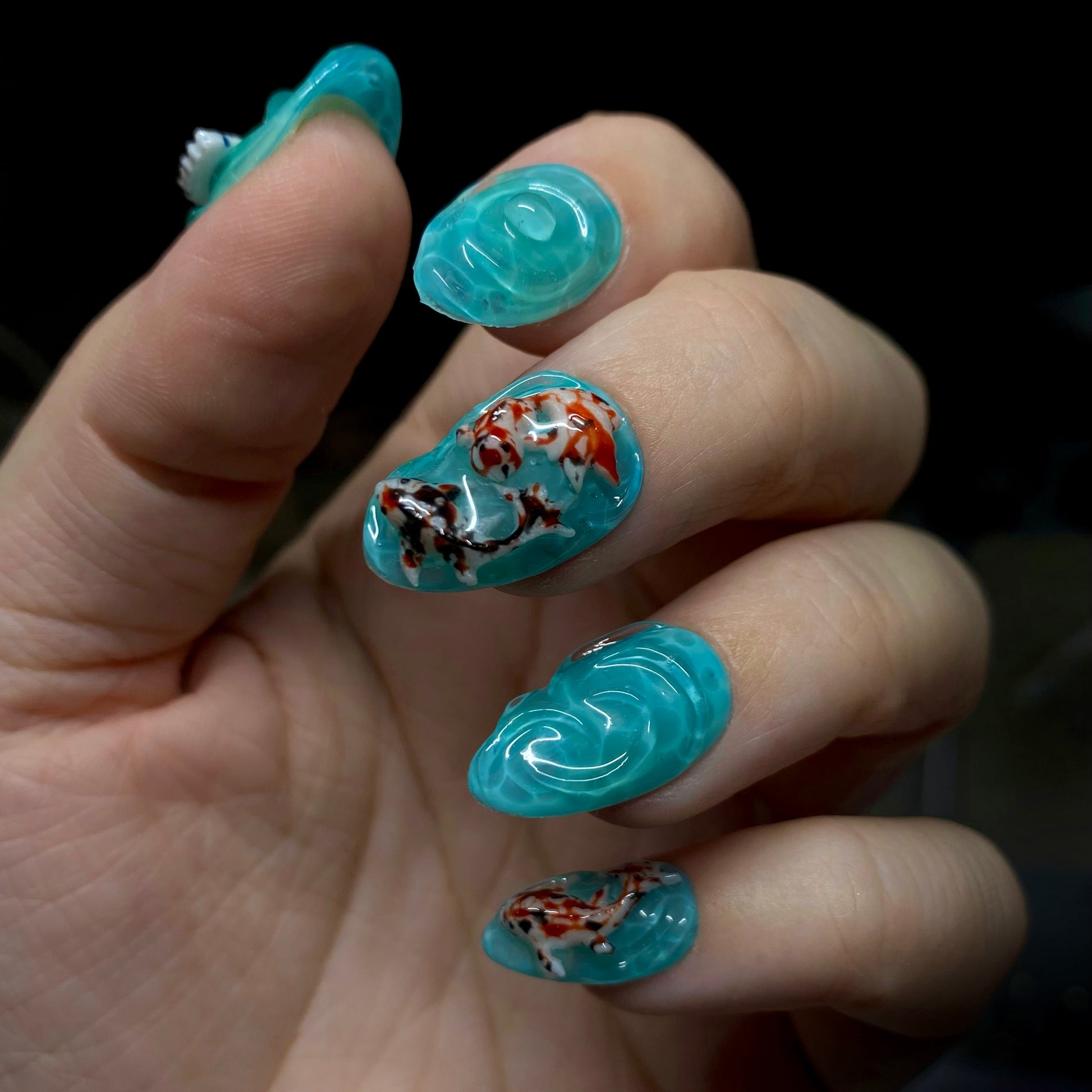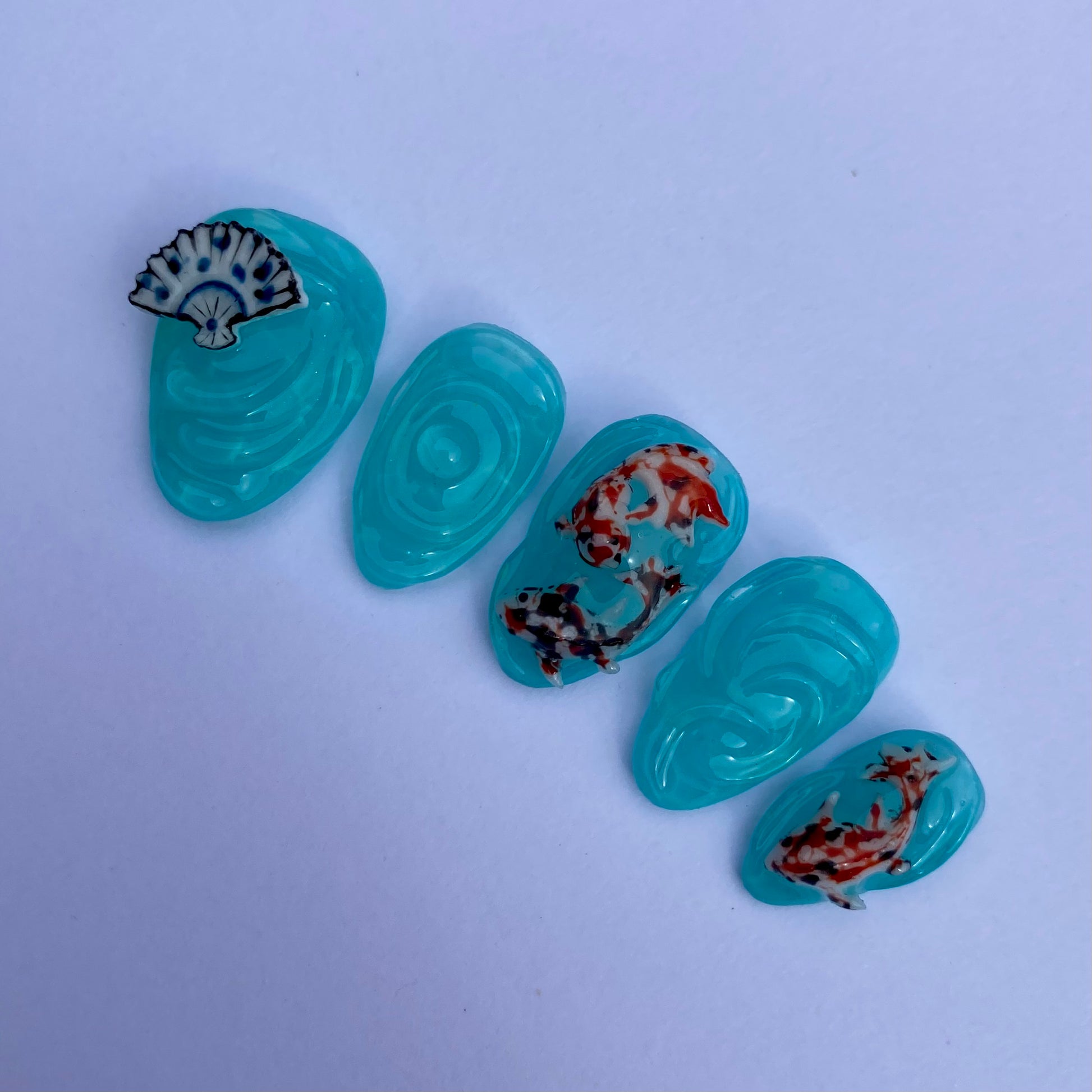 Laisse tes ongles s'évader au Japon avec nos Press On Nails "Koi & Éventail" : de mignons poissons koi qui nagent dans l'eau, et un éventail pour la touche traditionnelle.