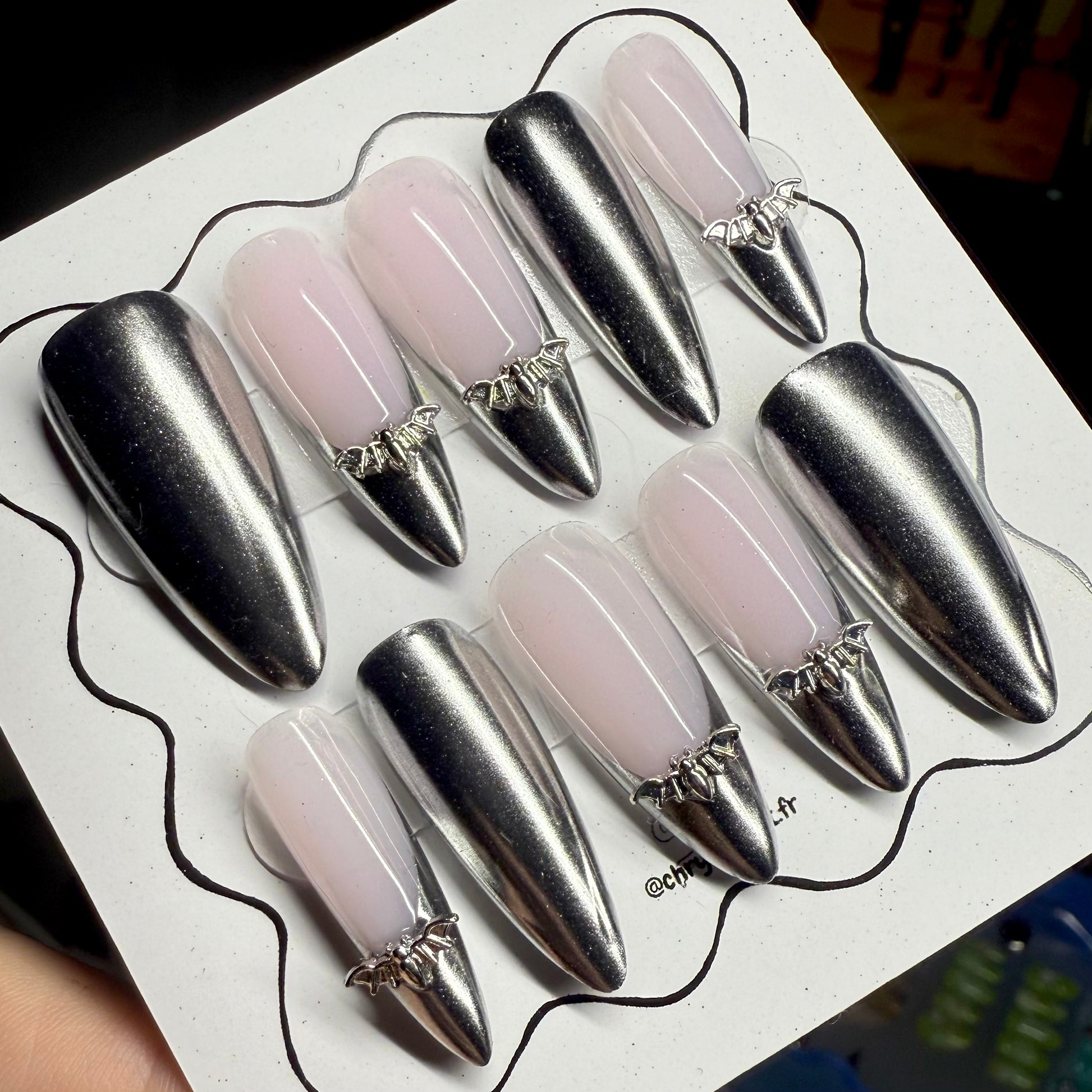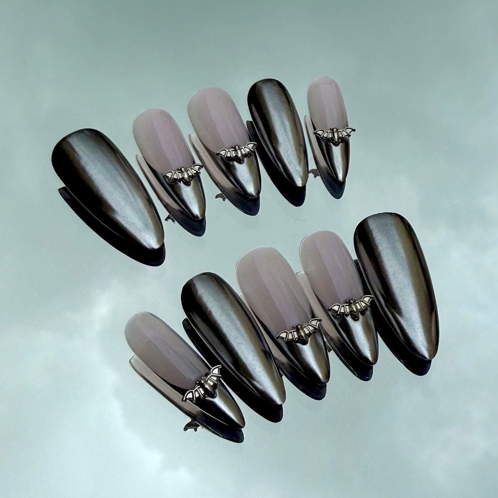 L'élégance rencontre le côté obscur. Avec Bat Couture, opte pour un look qui revisite la French classique avec des bouts d'ongles en chrome argenté et de délicats petits bats pour une touche de gothique-chic.