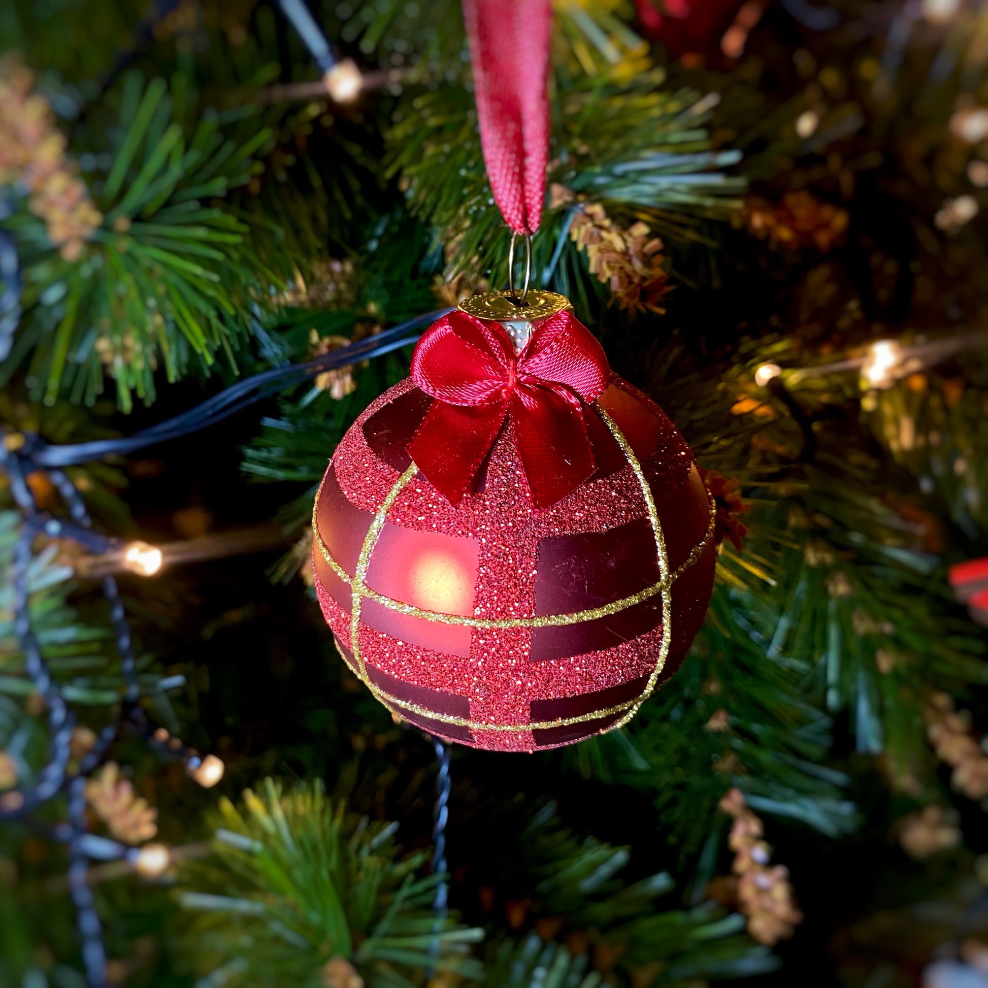 Boule de Noël en verre rouge avec son petit nœud.