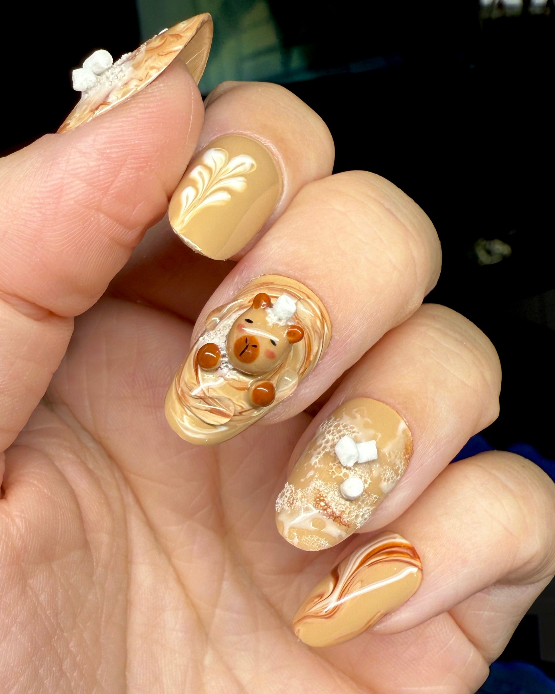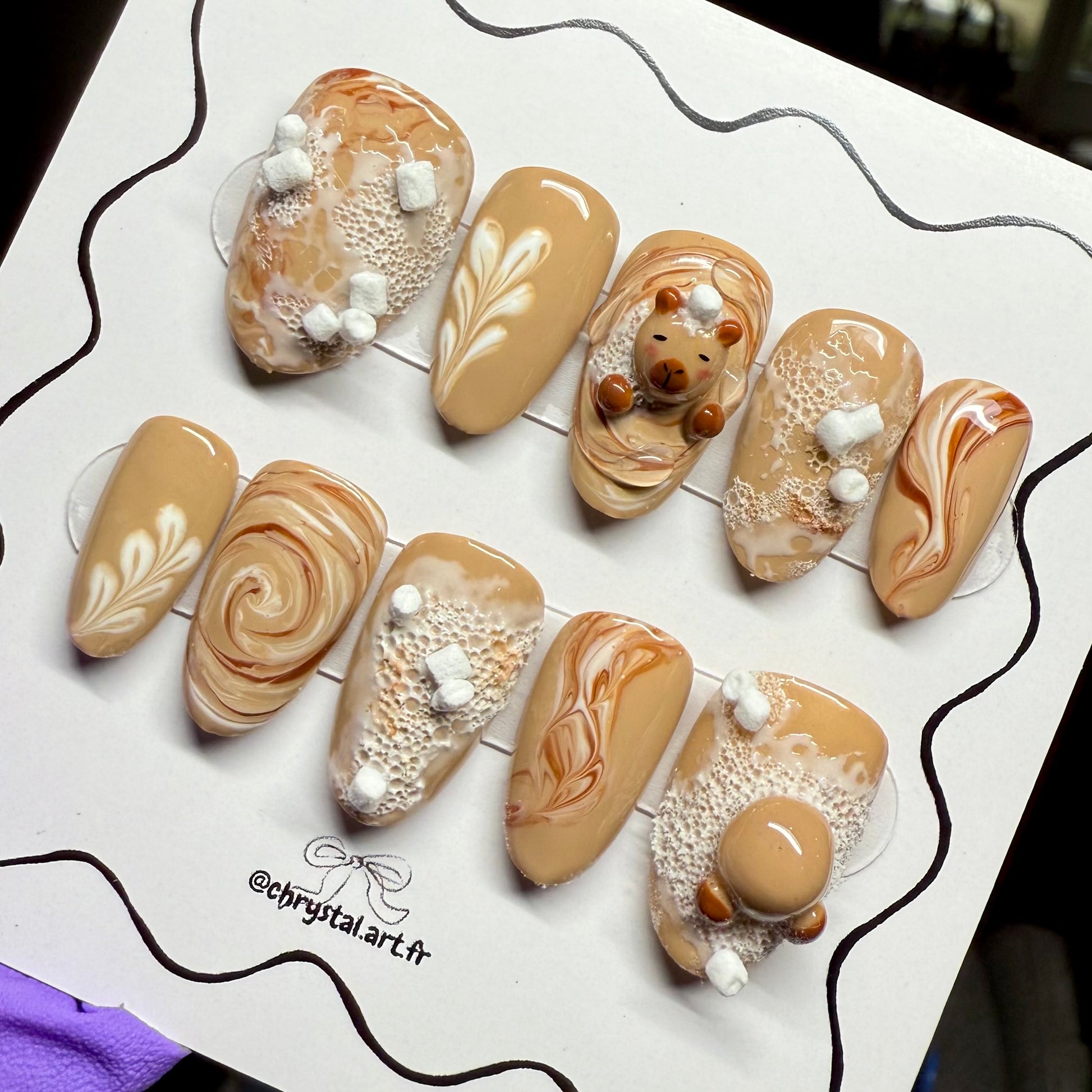 Capyccino, c'est ta dose de douceur et de style pour l'automne. Une manucure qui sent bon le café, avec un Capybara qui te donne envie de rester sous la couette.