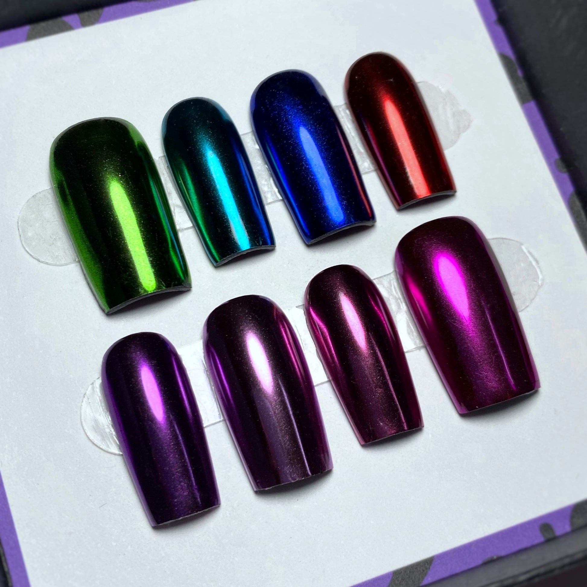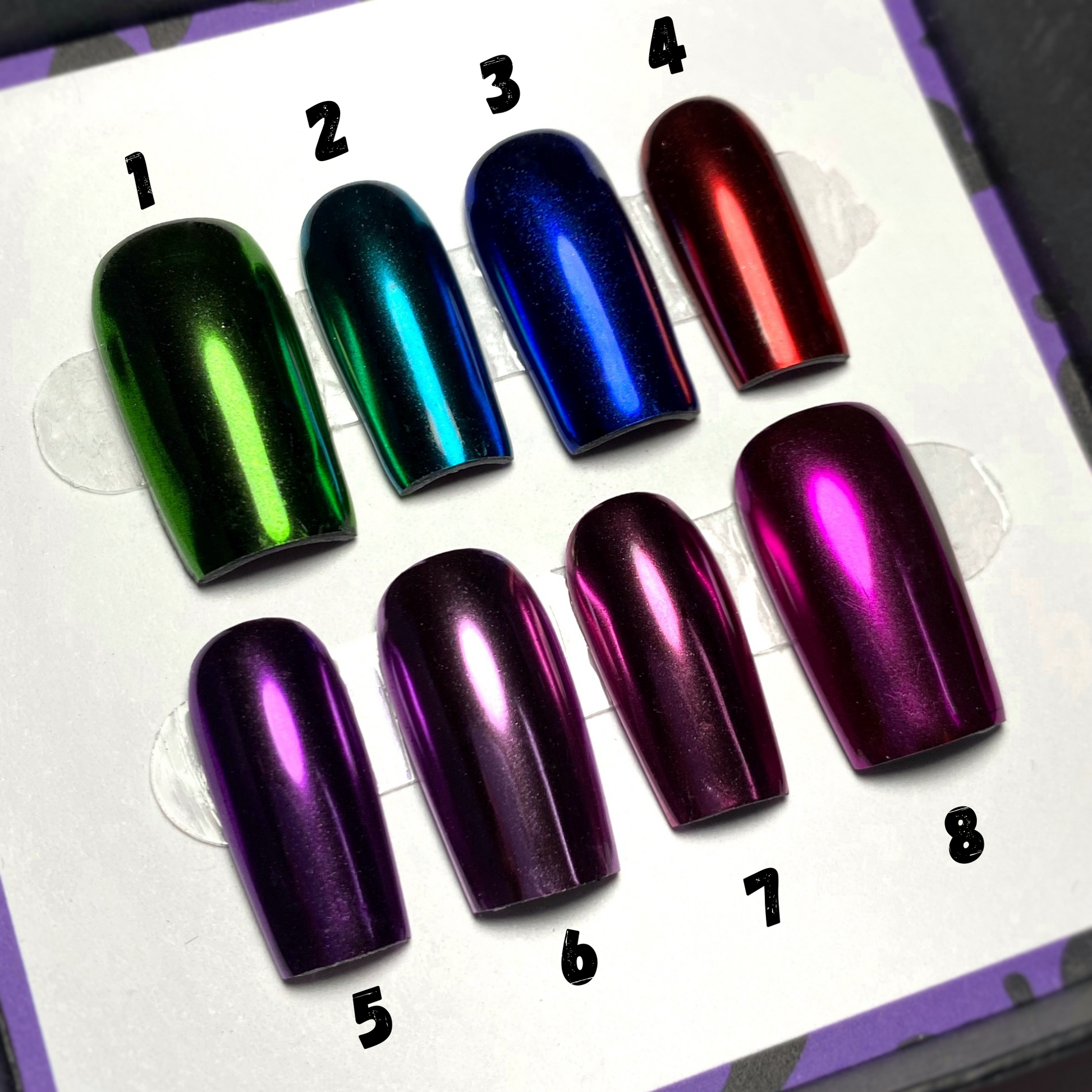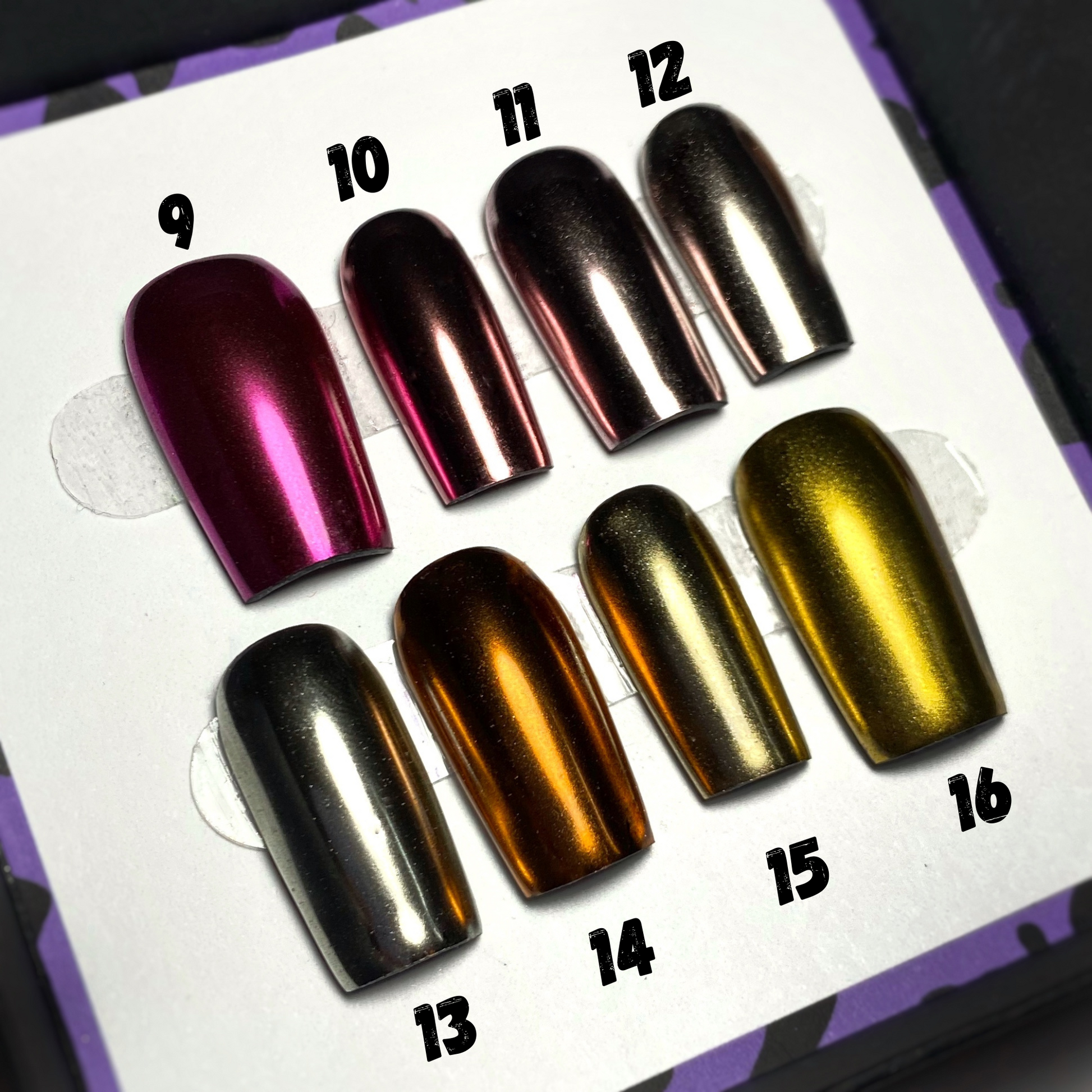 16 magnifiques chromes pour tes ongles, allant du vert au doré. Transforme tes ongles en véritables œuvres d'art. Avec une large gamme de couleurs éclatantes, tu peux exprimer ta créativité sans limite.