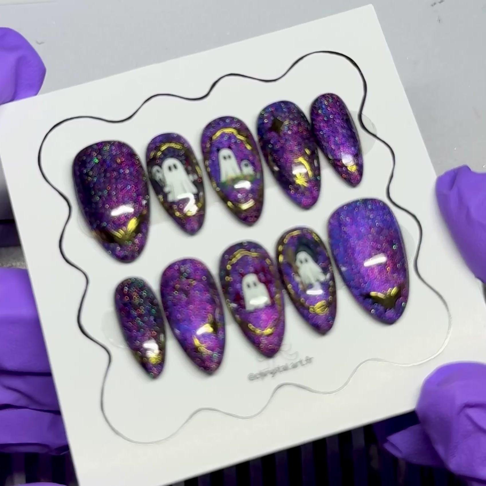 Prête pour un Halloween inoubliable ? Cosmic Boo, la manucure qui te fait voyager dans les étoiles, avec de mignons petits fantômes.