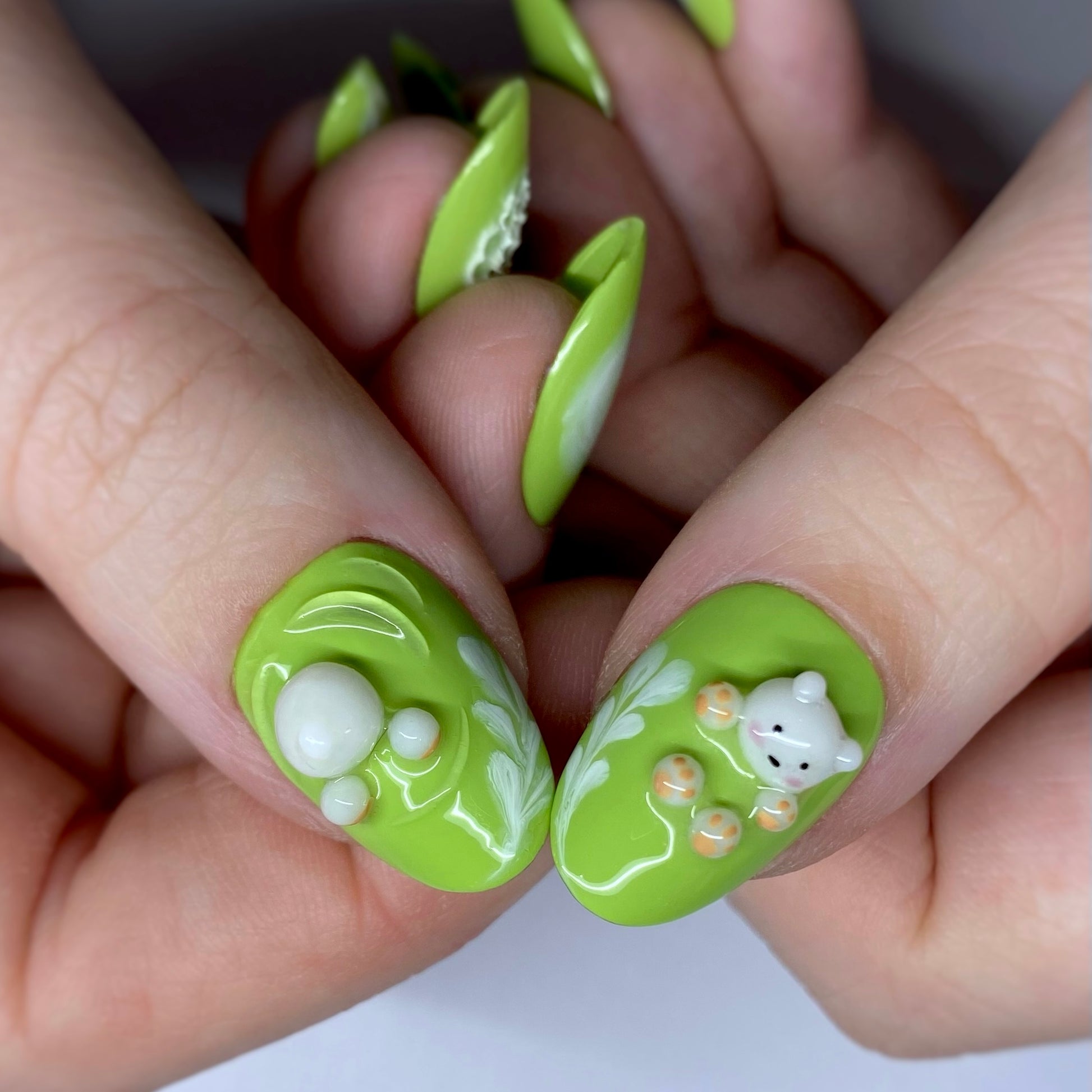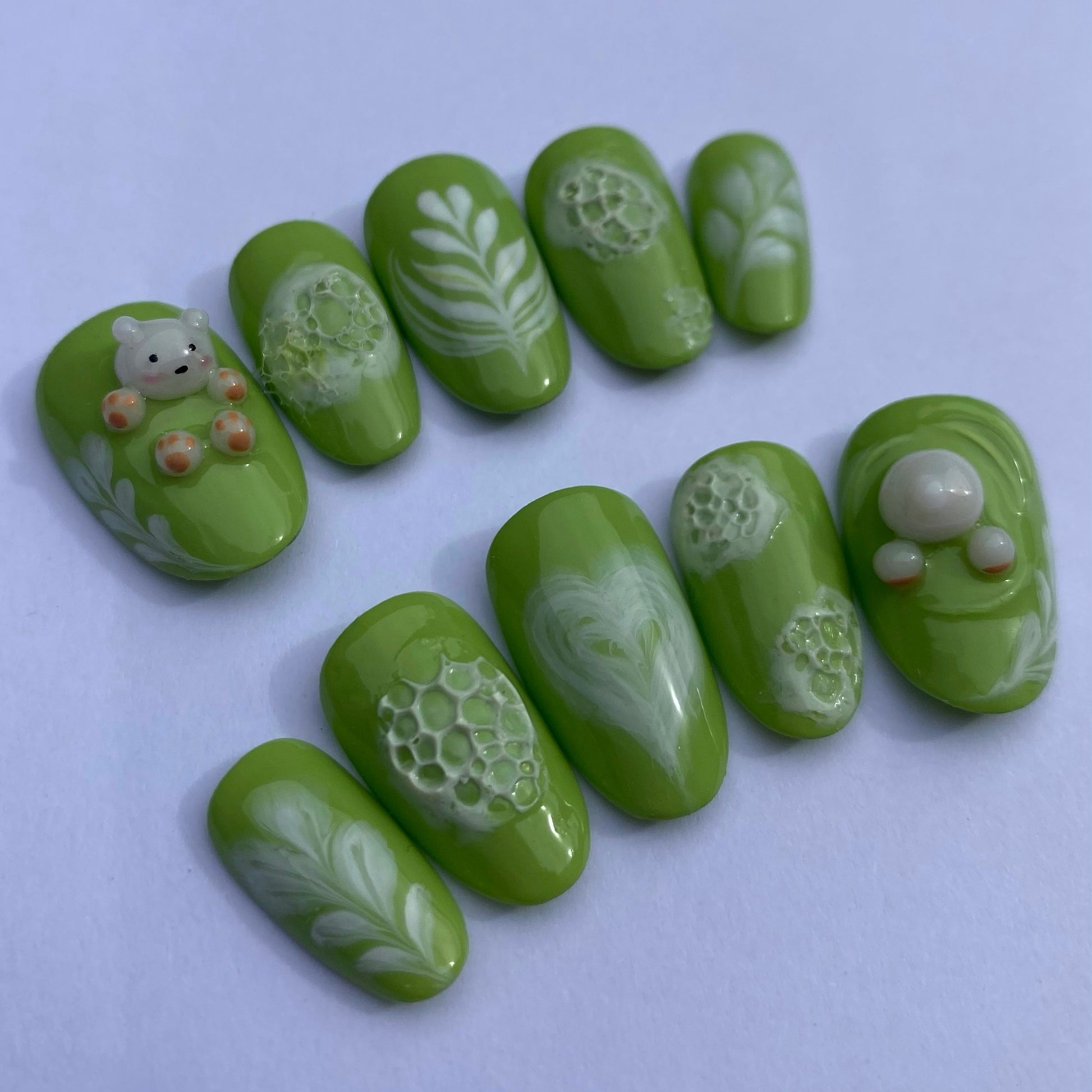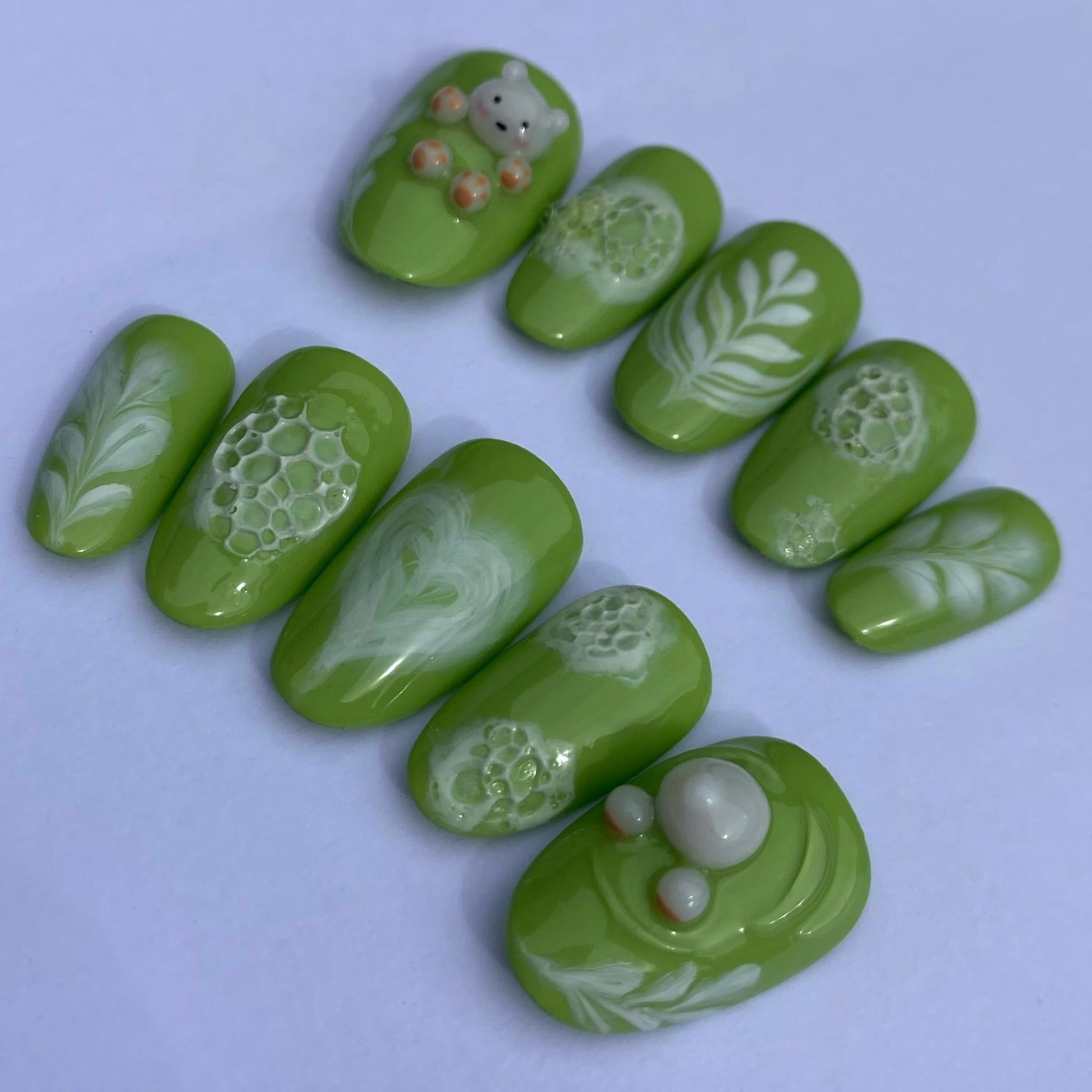 Plonge dans un bain de douceur avec les Press On Nails "Matcha Time" : un adorable ourson se prélasse dans un matcha crémeux