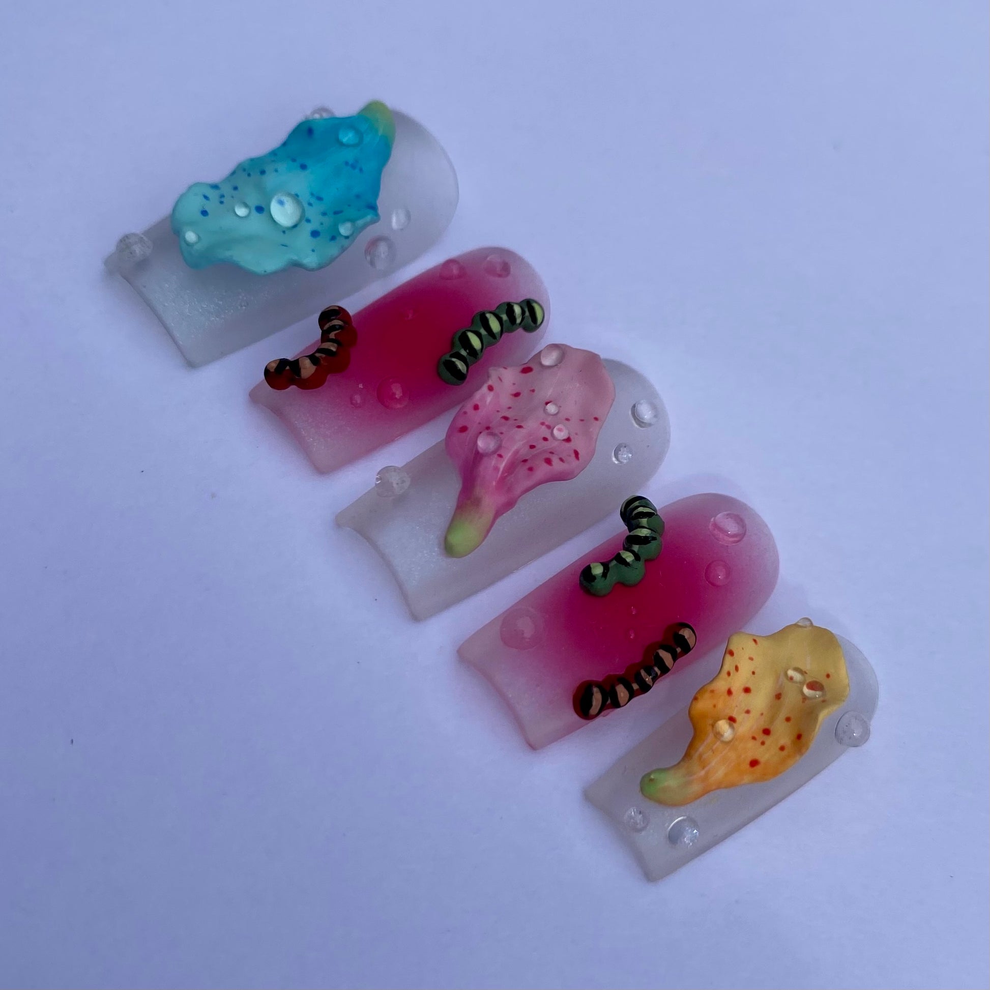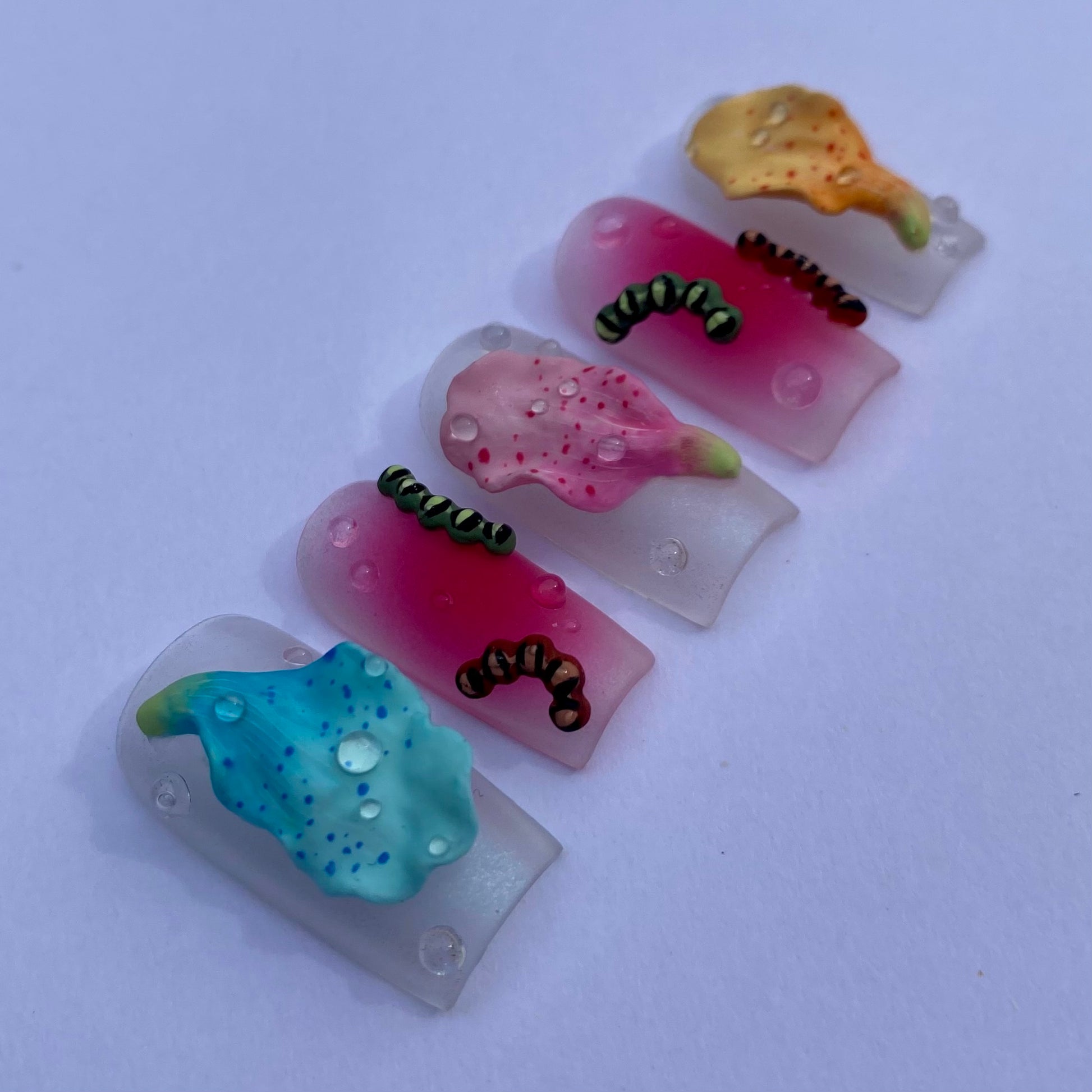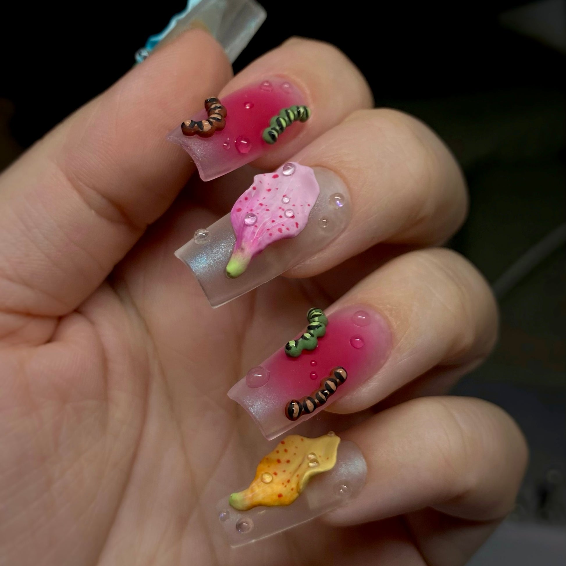 Laisse la nature éclore sur tes ongles avec nos Press On Nails "Rosée du Matin" : des pétales de lys colorés, de mignonnes chenilles et des gouttes de rosée scintillantes.