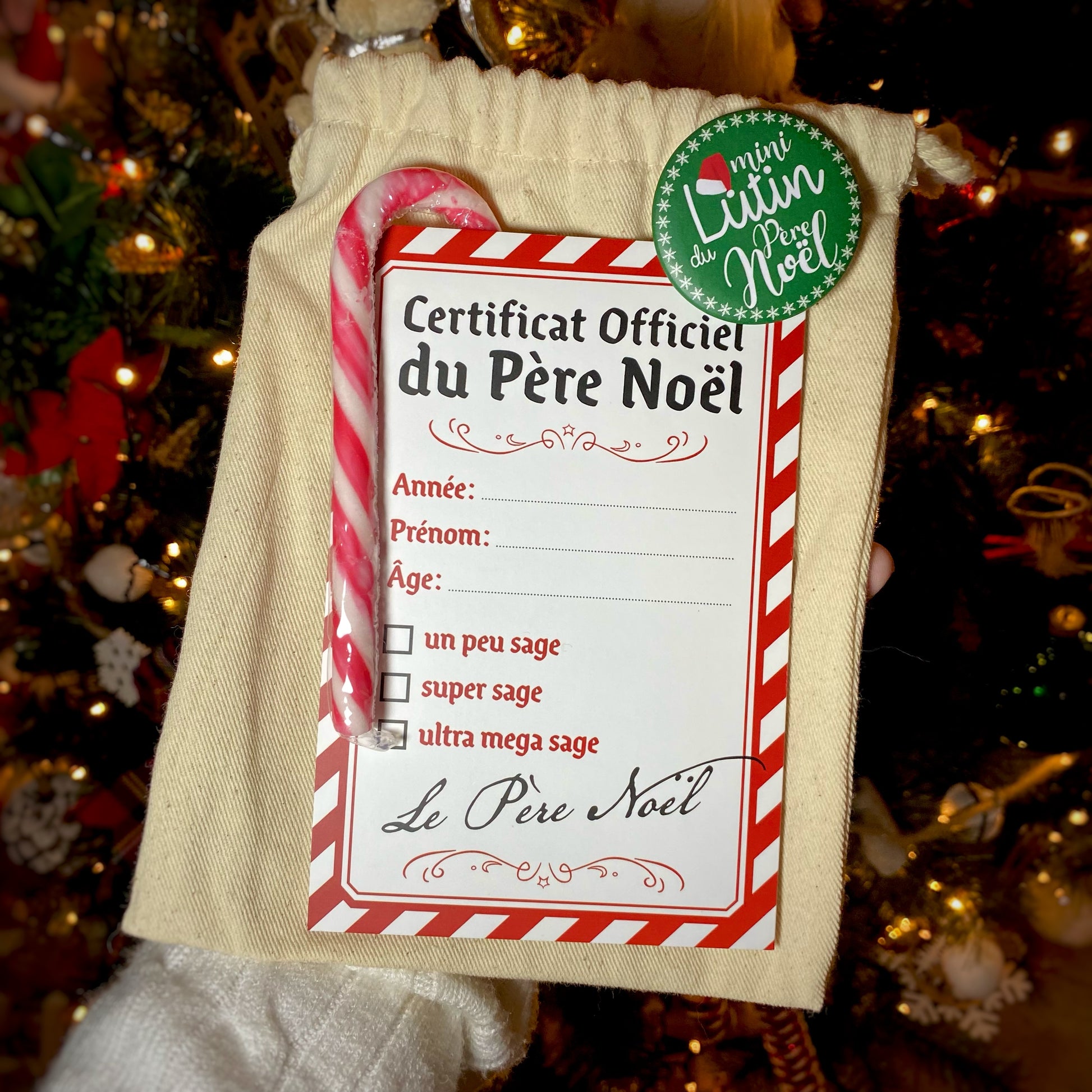 Ce qu'il contient : Un badge mini lutin du père Noël, le certificat du Père Noël, un sucre d'orge le tout dans ca petite pochette.