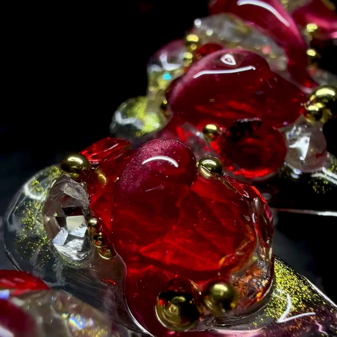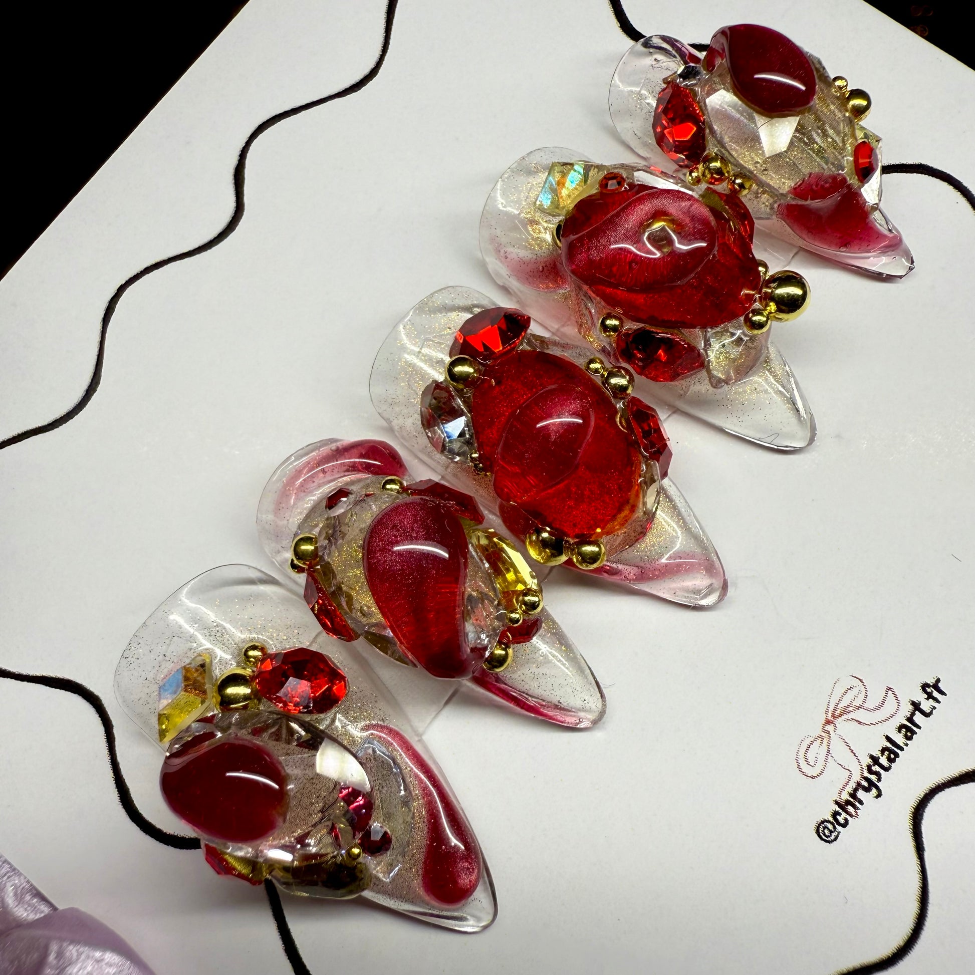 Inspiré des ongles préférée de la Mère Noël, ce modèle rouge rubis et or offre un effet bijou unique. Des volumes 3D éclatants, une brillance luxueuse et un style festif irrésistible : la touche parfaite pour des fêtes glamour et magiques.