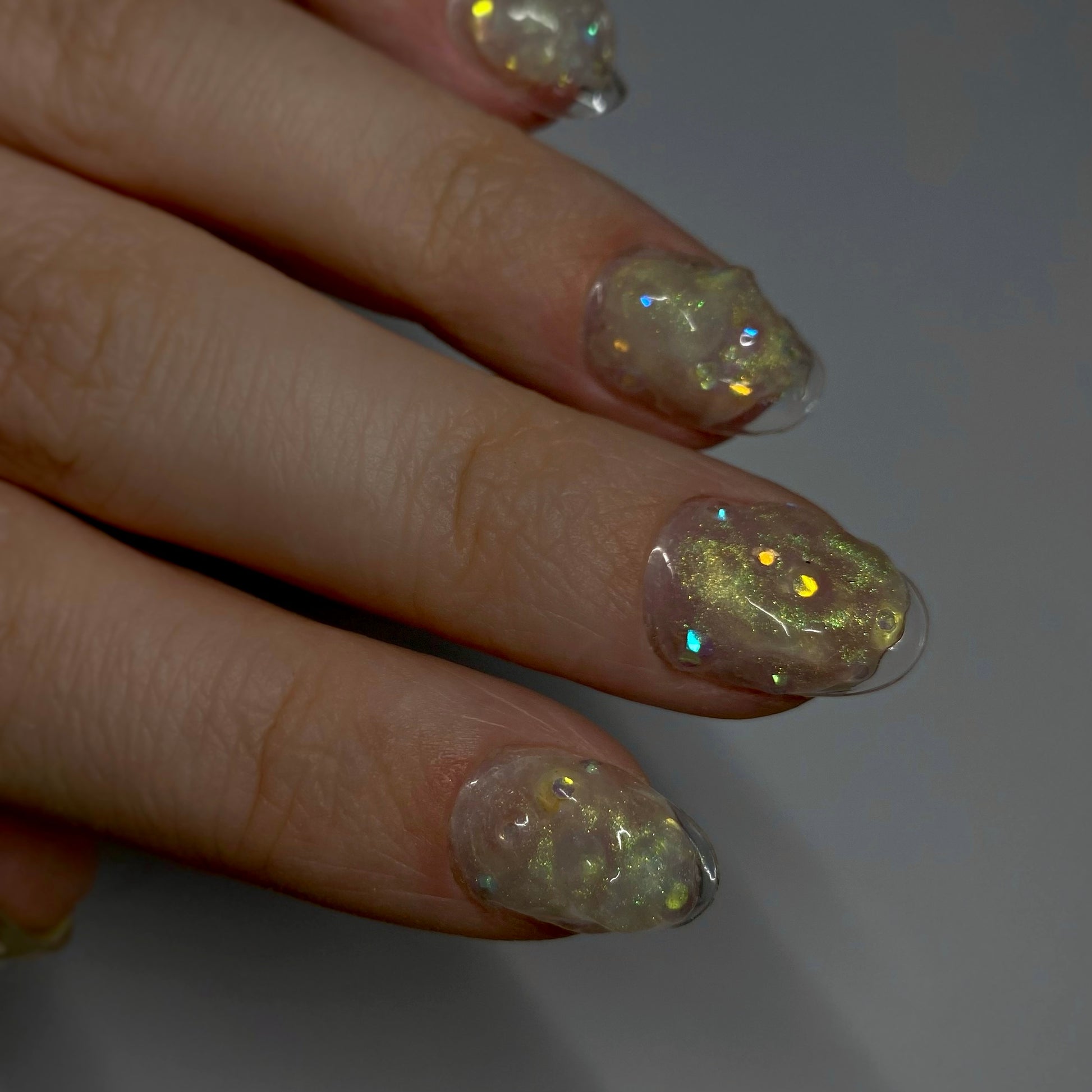 Un jeu de volumes et de lumières avec ce modèle : relief 3D, paillettes et strass pour des ongles qui captent tous les regards.