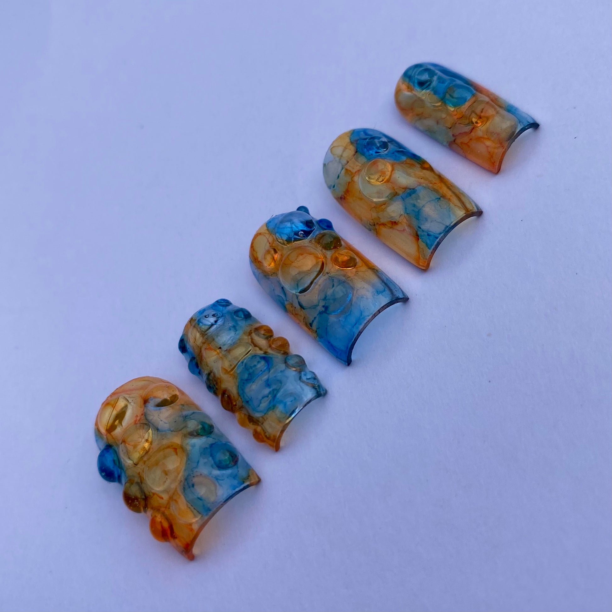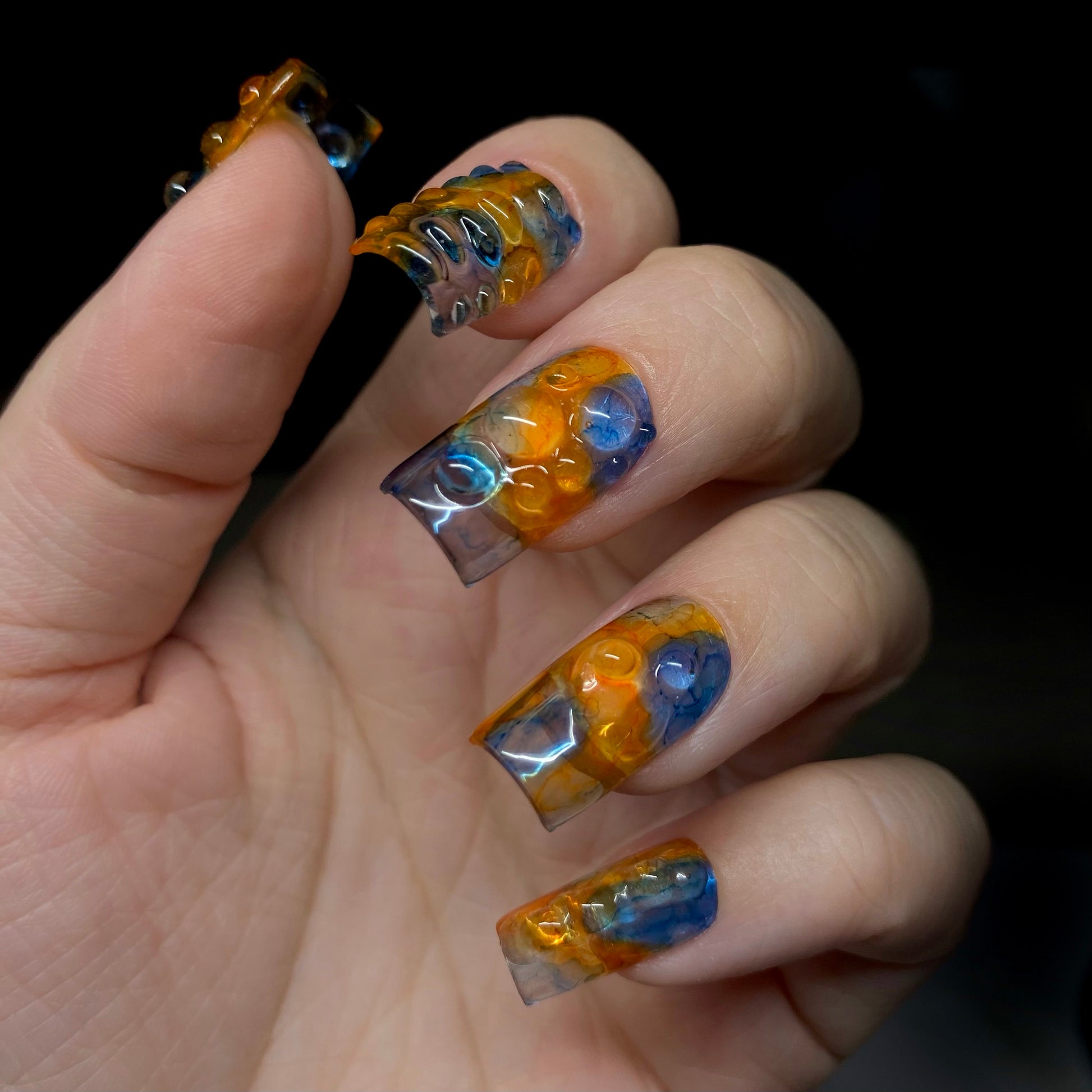 Laisse tes ongles exprimer leur côté artistique avec des touches de bleu et d'orange, et un effet 3D transparent qui donne du relief. Un design unique pour un style qui ne passe pas inaperçu !